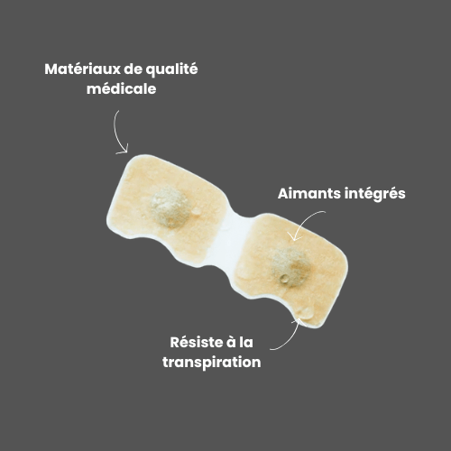 - Port & retrait : Portez-la pendant la nuit (ou l’activité). Pour retirer, ôtez d’abord la bande, puis décollez doucement chaque patch. En cas de peau sensible, humidifiez légèrement le patch avant de l’enlever.